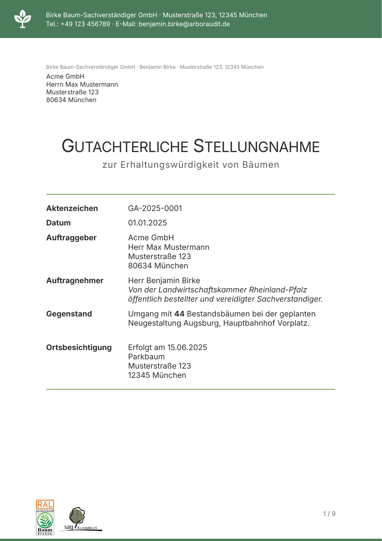 Diese Gutachterliche Stellungnahme wurde mit ArborAudit erstellt – ohne Word, ohne Nachbearbeiten. Perfektes Layout, korrekte Seitenumbrüche und alle Daten automatisch an der richtigen Stelle.