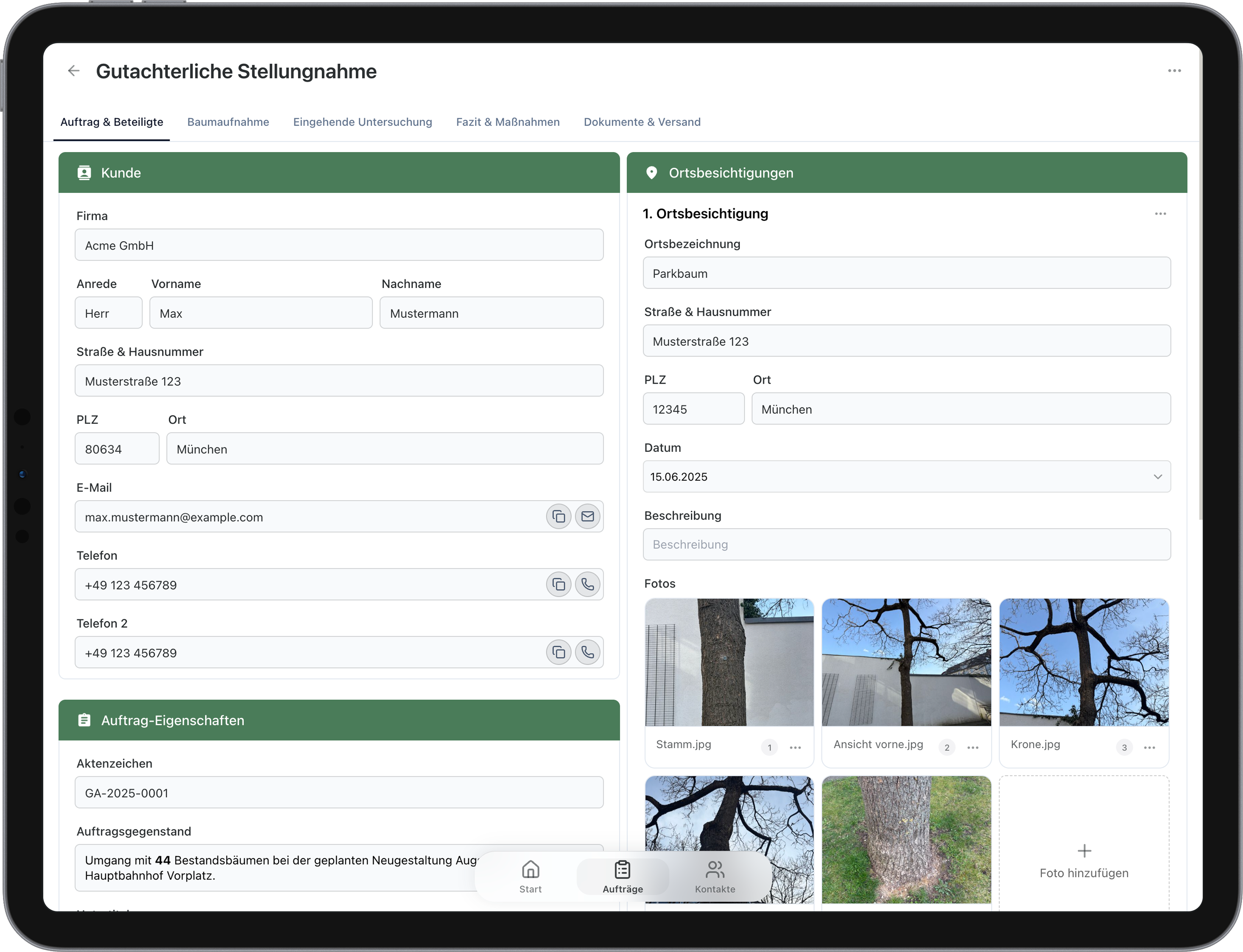 Lege den Auftrag an und trage Baumart, Standort, Vitalität, Befund und Fotos ein – strukturiert in einem Formular, ohne Doppelarbeit.